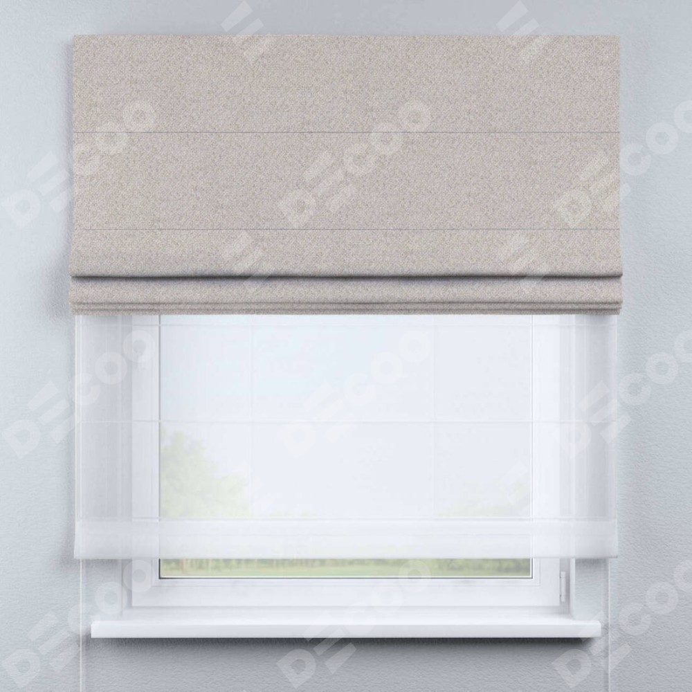 Двойная римская штора «День-ночь» от производителя Cortin предназначена для использования в проёмах. Эта штора уникальна тем, что состоит из двух полотен. На лицевой стороне находится лён димаут бежевый (артикул: 01), обеспечивающий эффективное затемнение. В комплект также входит вторая ткань — легкий белый тюль (артикул: V-01), который добавляет изящества и легкости оформлению окна. Кроме того, доступны и другие разновидности ткани тюль, выбор которых доступен по ссылке .