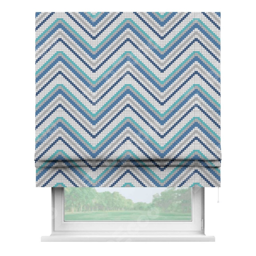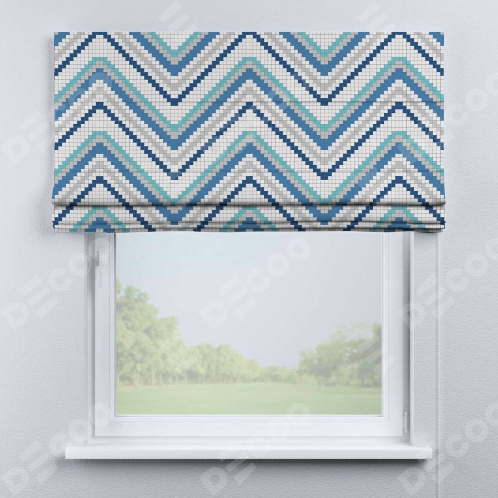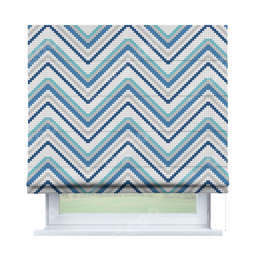 Классическая римская штора производителя «Cortin», пошита из ткани геометрическая волна, артикул:. Имеет универсальный механизм и подходит для монтажа: на потолок, на стену и в нишу.