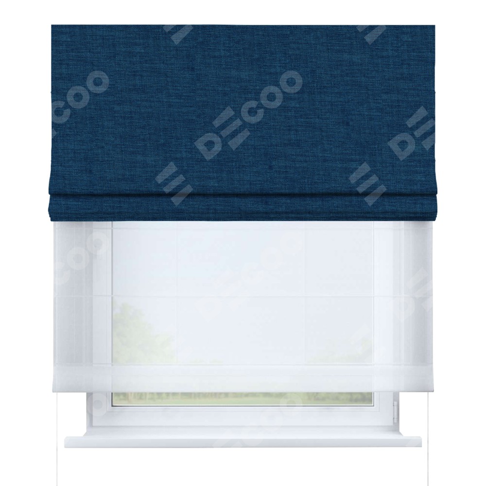 Двойная римская штора «День-ночь» от производителя Cortin предназначена для использования в проёмах. Эта штора уникальна тем, что состоит из двух полотен. На лицевой стороне находится лён синий (артикул: 104496), обеспечивающий эффективное затемнение. В комплект также входит вторая ткань — легкий белый тюль (артикул: V-01), который добавляет изящества и легкости оформлению окна. Кроме того, доступны и другие разновидности ткани тюль, выбор которых доступен по ссылке .