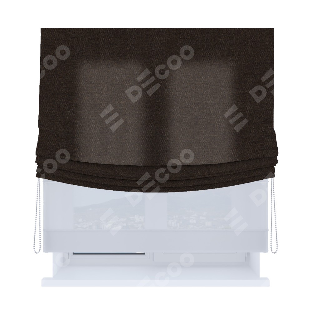 Двойная римская штора «День-ночь» от производителя Cortin предназначена для использования в проёмах. Эта штора уникальна тем, что состоит из двух полотен. На лицевой стороне находится лён тёмно-коричневый (артикул: 104497), обеспечивающий эффективное затемнение. В комплект также входит вторая ткань — легкий белый тюль (артикул: V-01), который добавляет изящества и легкости оформлению окна. Кроме того, доступны и другие разновидности ткани тюль, выбор которых доступен по ссылке .