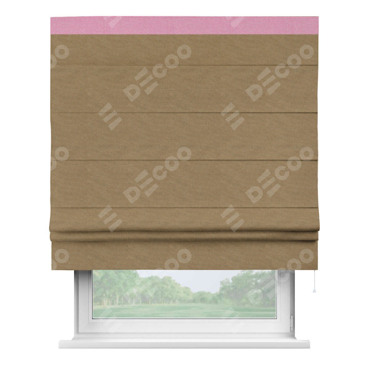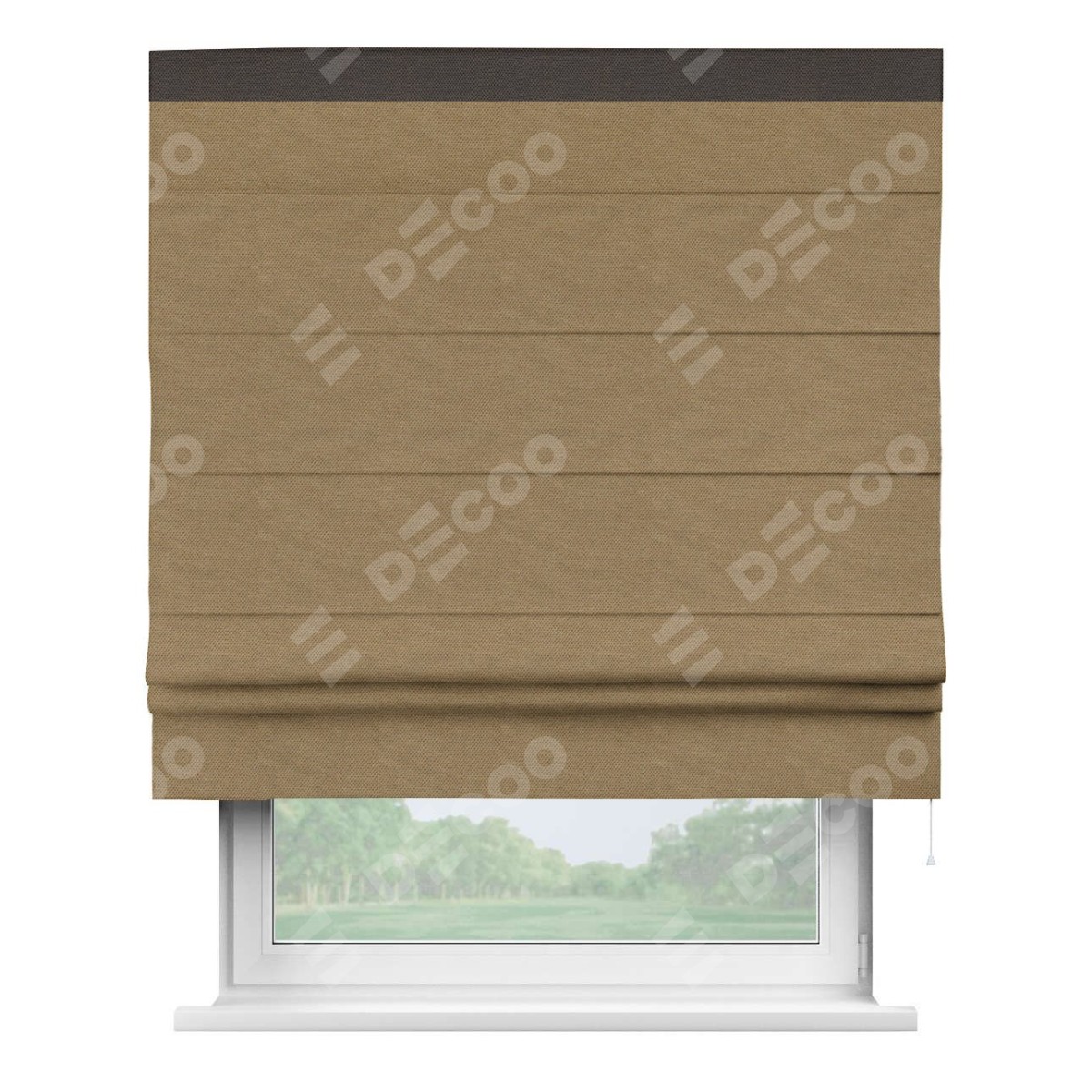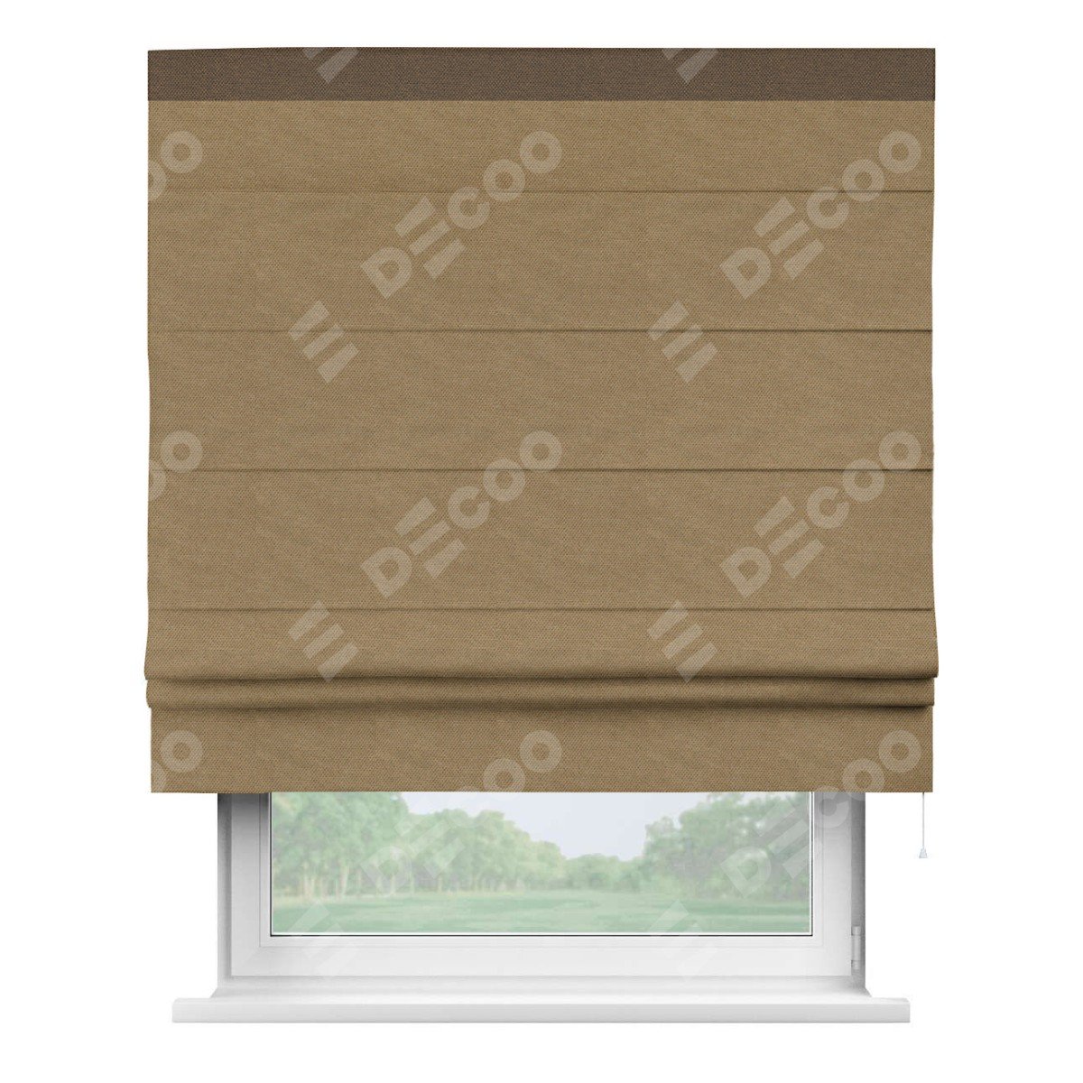 Римская штора производителя «Cortin», используется для проёма, пошита из ткани лён димаут Коричневый, артикул 83026. Отделка шторы кантом «Кинг», ткань для канта используется из льна димаут разной расцветки на выбор. Имеет универсальный механизм и подходит для монтажа: на потолок, на стену и в нишу.