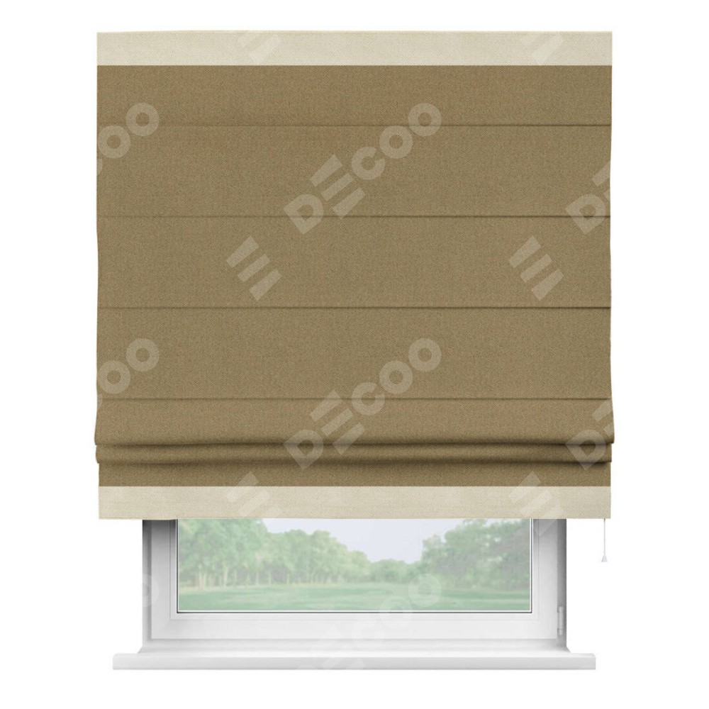Римская штора производителя «Cortin», используется для проёма, пошита из ткани лён димаут оливковый, артикул 16243. Отделка шторы кантом «Горизонт», ткань для канта используется из льна димаут разной расцветки на выбор. Имеет универсальный механизм и подходит для монтажа: на потолок, на стену и в нишу.