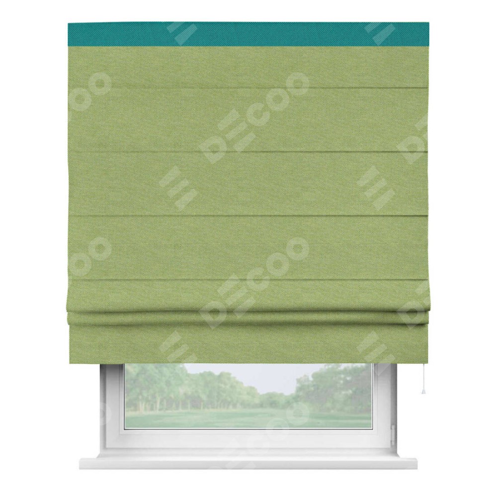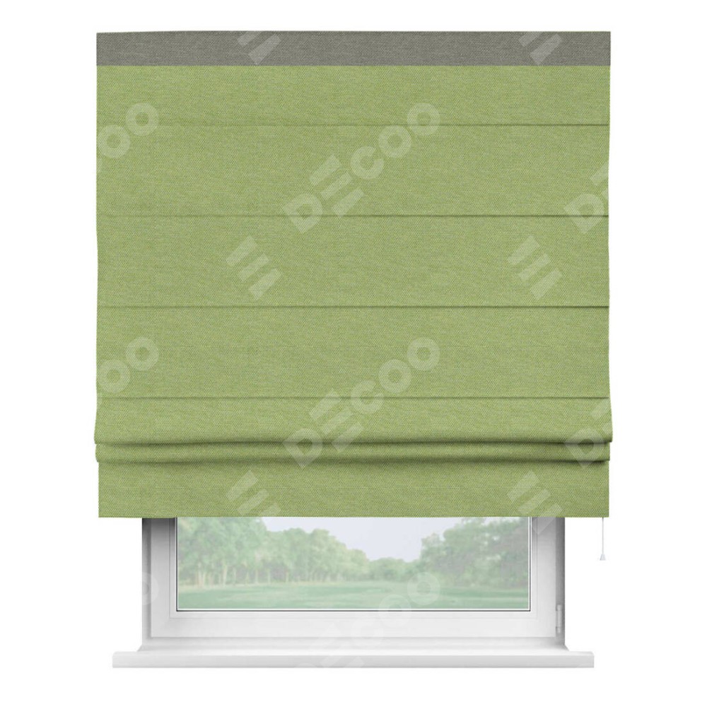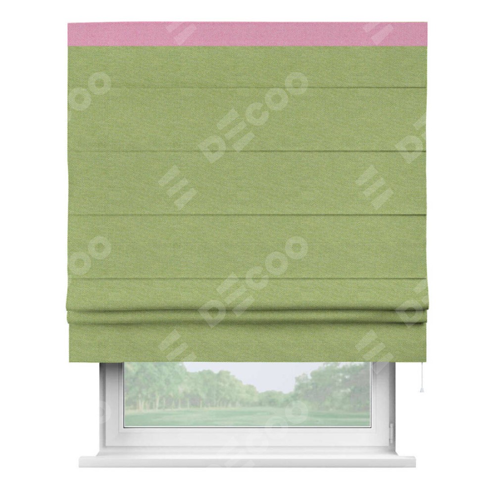 Римская штора производителя «Cortin», используется для проёма, пошита из ткани лён димаут салатовый, артикул 83032. Отделка шторы кантом «Кинг», ткань для канта используется из льна димаут разной расцветки на выбор. Имеет универсальный механизм и подходит для монтажа: на потолок, на стену и в нишу.