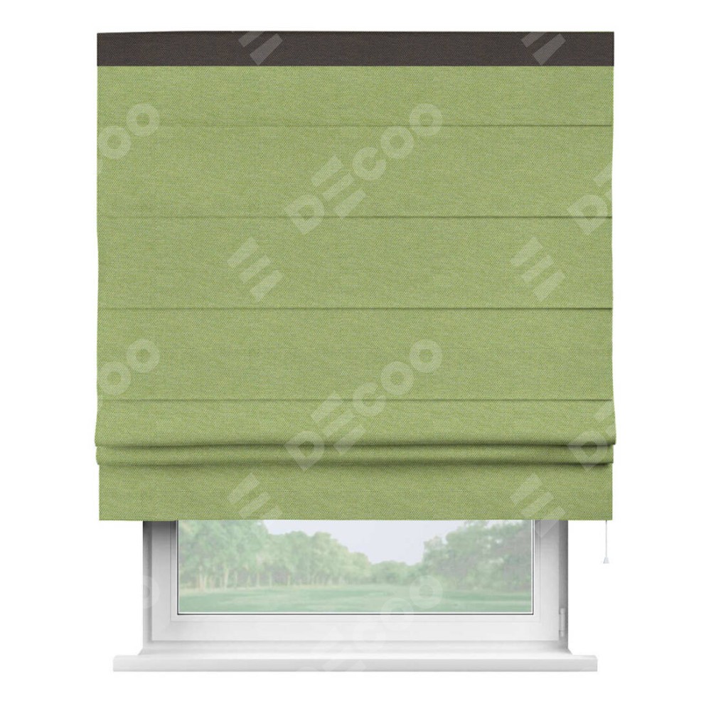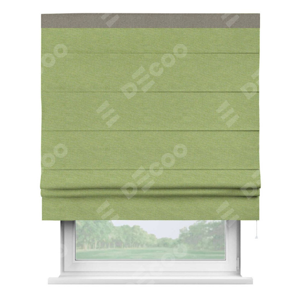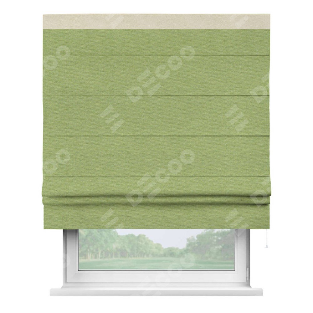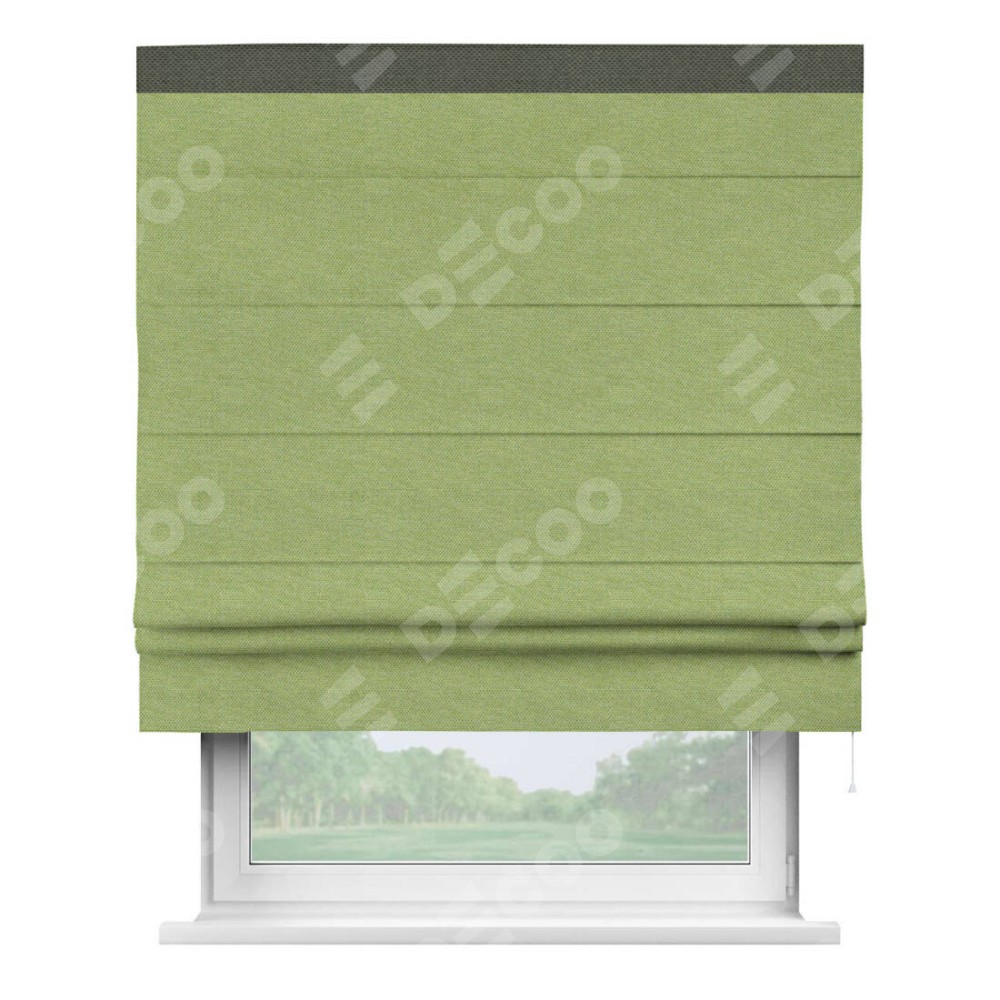 Римская штора производителя «Cortin», используется для проёма, пошита из ткани лён димаут салатовый, артикул 83032. Отделка шторы кантом «Кинг», ткань для канта используется из льна димаут разной расцветки на выбор. Имеет универсальный механизм и подходит для монтажа: на потолок, на стену и в нишу.