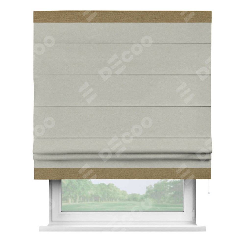 Римская штора производителя «Cortin», используется для проёма, пошита из ткани лён димаут светло-серый, артикул 83025. Отделка шторы кантом «Горизонт», ткань для канта используется из льна димаут разной расцветки на выбор. Имеет универсальный механизм и подходит для монтажа: на потолок, на стену и в нишу.