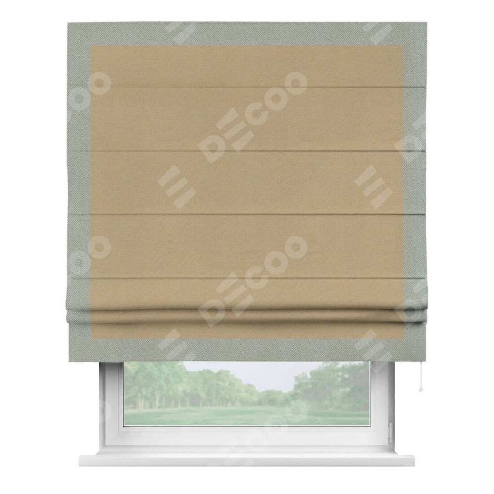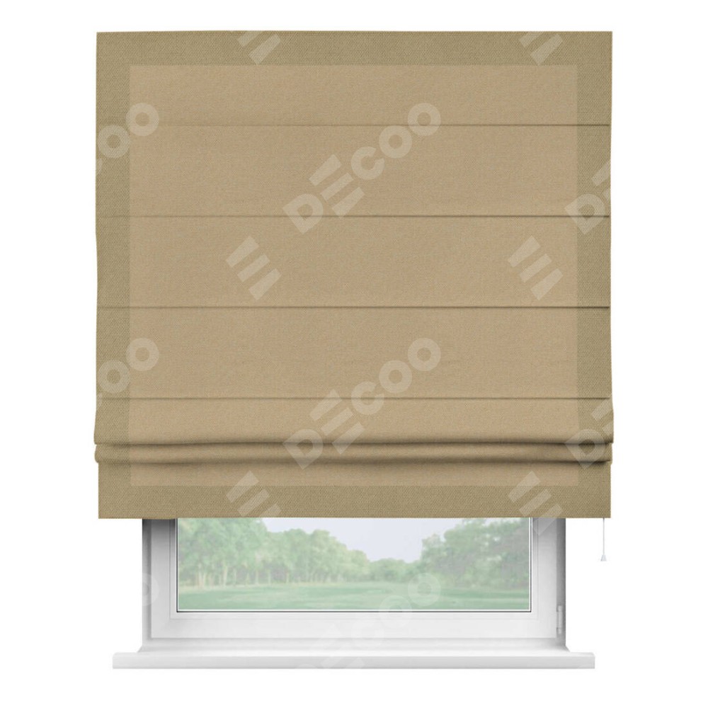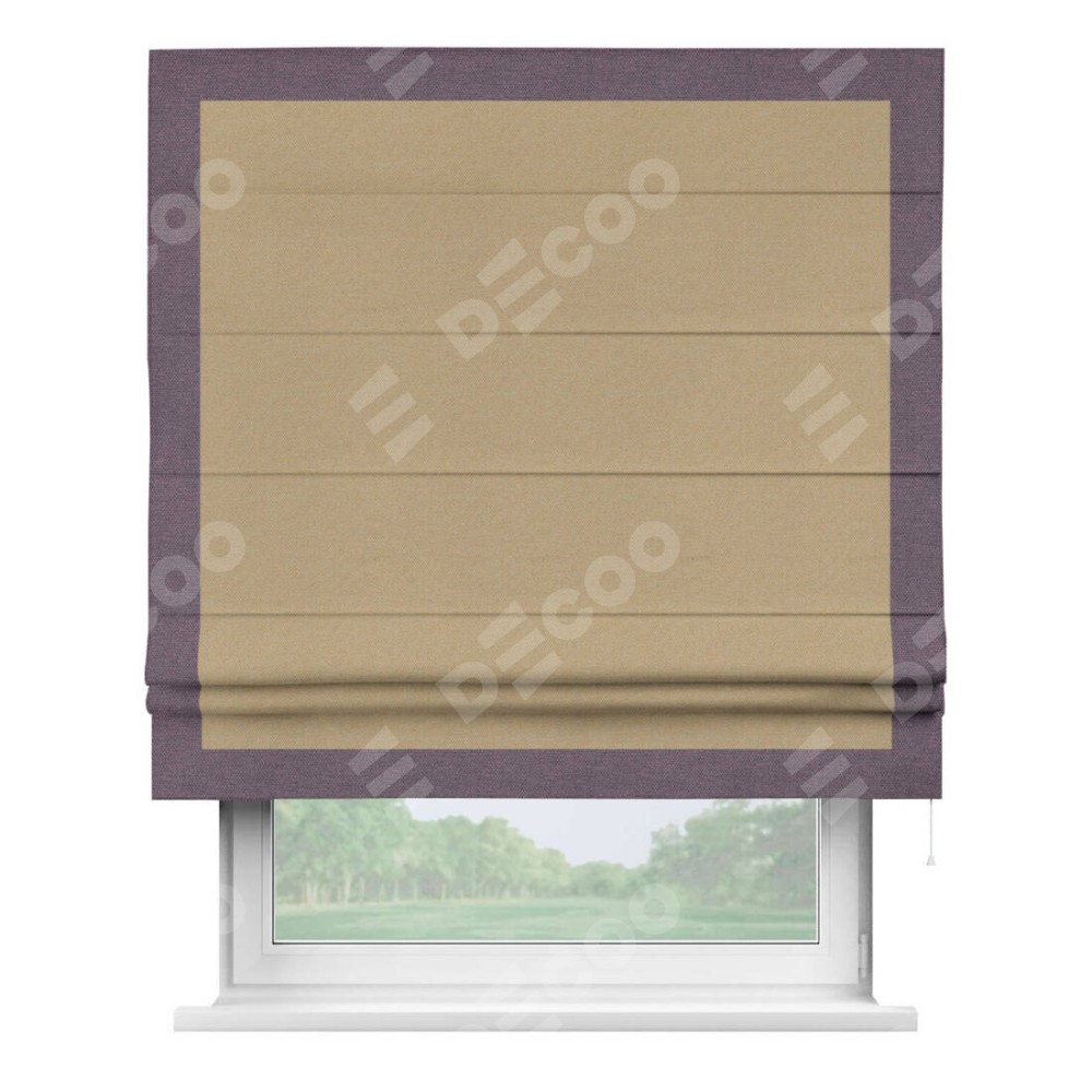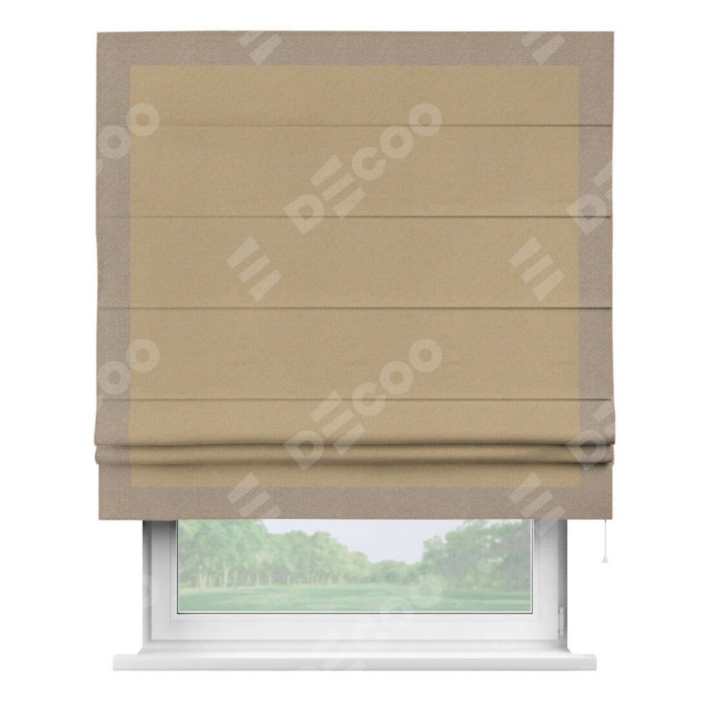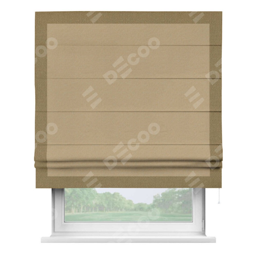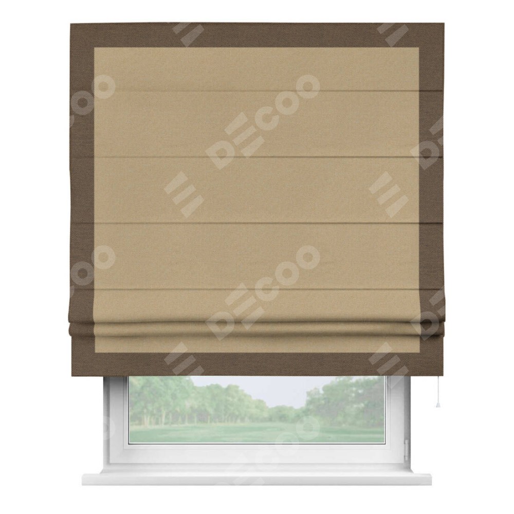 Римская штора производителя «Cortin», используется для проёма, пошита из ткани лён димаут тёмно-бежевый, артикул 83037. Отделка шторы кантом «Чесс», ткань для канта используется из льна димаут разной расцветки на выбор. Имеет универсальный механизм и подходит для монтажа: на потолок, на стену и в нишу.