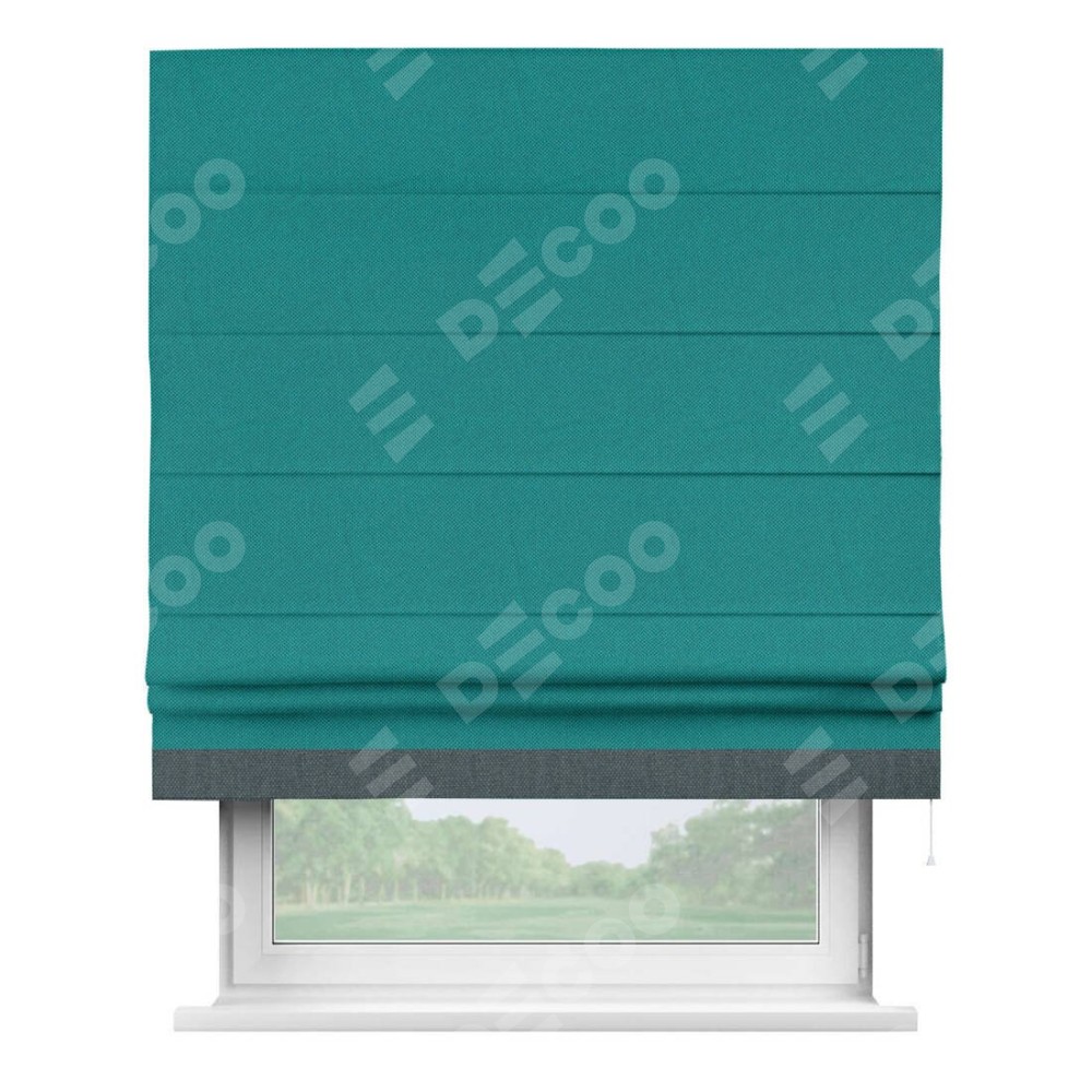 Римская штора производителя «Cortin», используется для проёма, пошита из ткани лён димаут тёмно-бирюзовый, артикул 318. Отделка шторы кантом «Джестер», ткань для канта используется из льна димаут разной расцветки на выбор. Имеет универсальный механизм и подходит для монтажа: на потолок, на стену и в нишу.