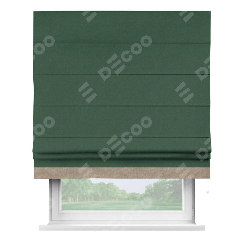 Римская штора производителя «Cortin», используется для проёма, пошита из ткани лён димаут тёмно-зелёный, артикул 16246. Отделка шторы кантом «Джестер», ткань для канта используется из льна димаут разной расцветки на выбор. Имеет универсальный механизм и подходит для монтажа: на потолок, на стену и в нишу.
