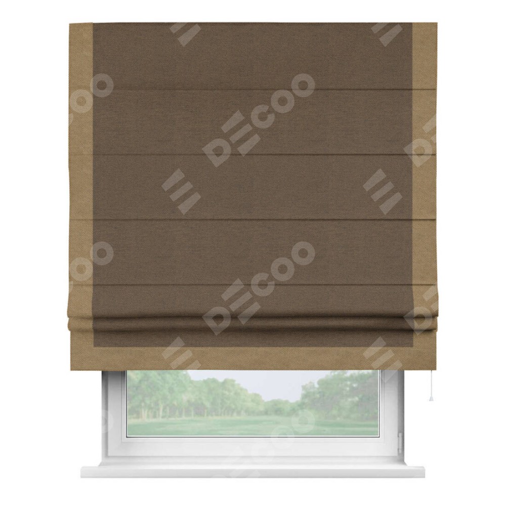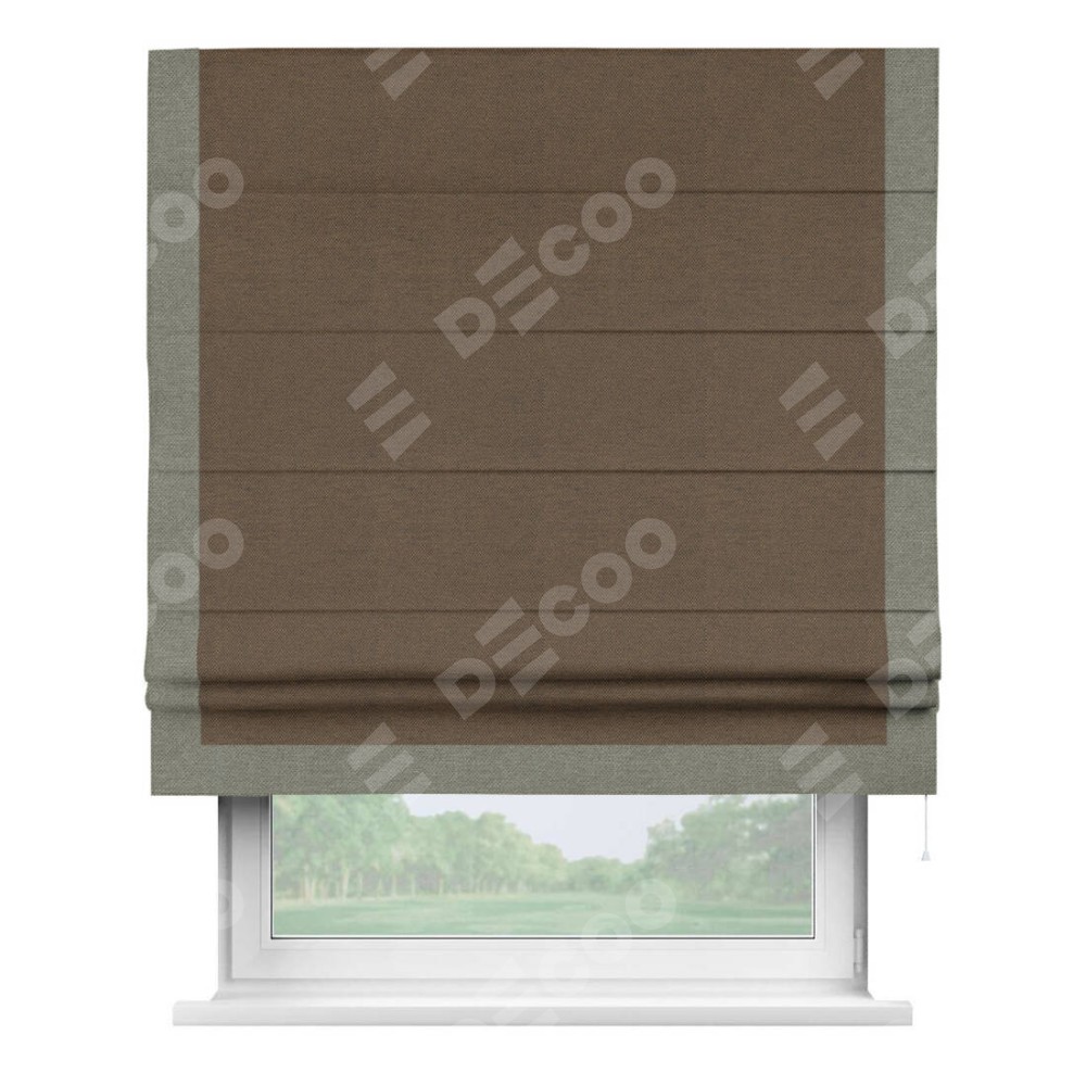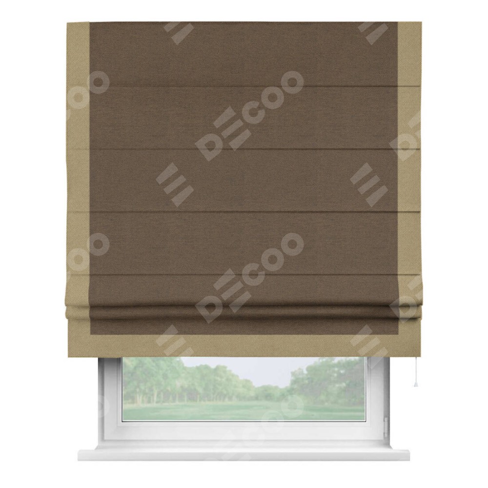 Римская штора производителя «Cortin», используется для проёма, пошита из ткани лён димаут тёмно-коричневый, артикул 83030. Отделка шторы кантом «Виктория», ткань для канта используется из льна димаут разной расцветки на выбор. Имеет универсальный механизм и подходит для монтажа: на потолок, на стену и в нишу.