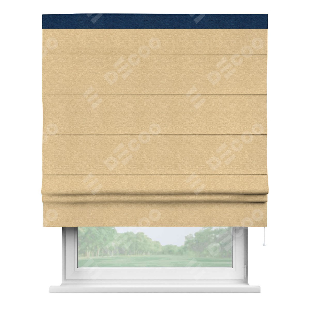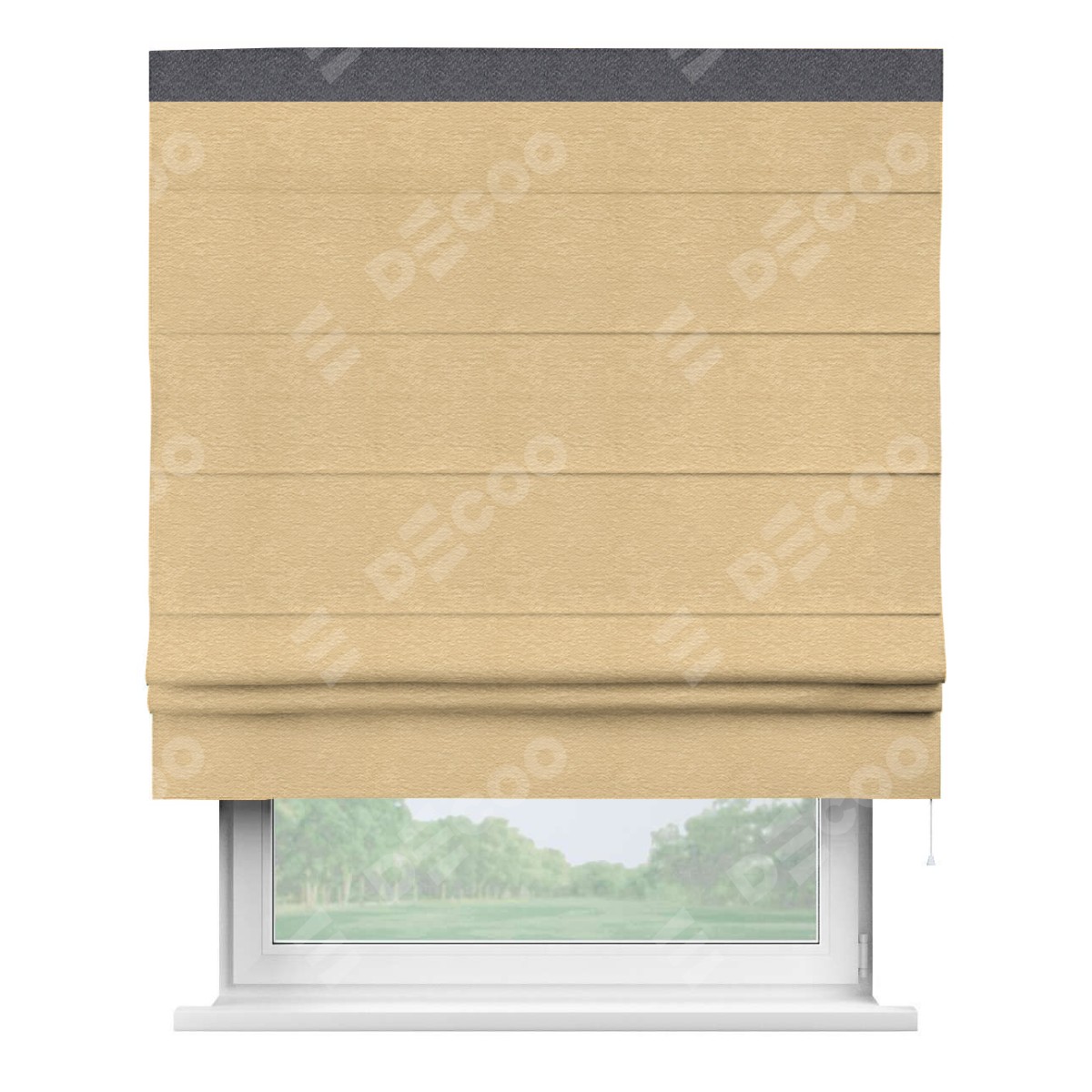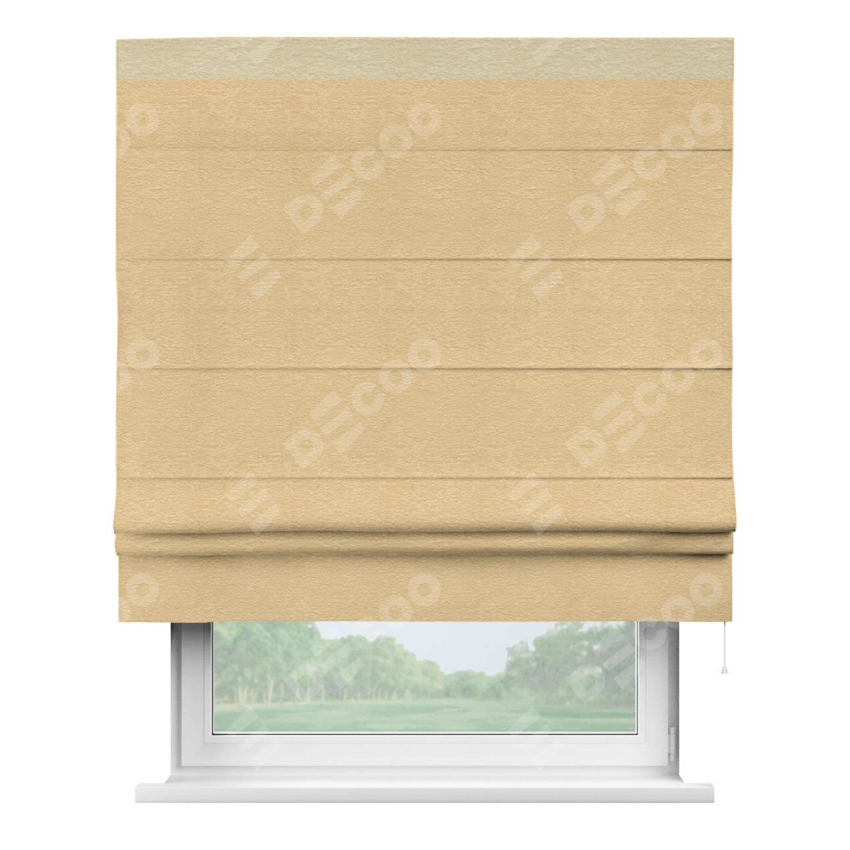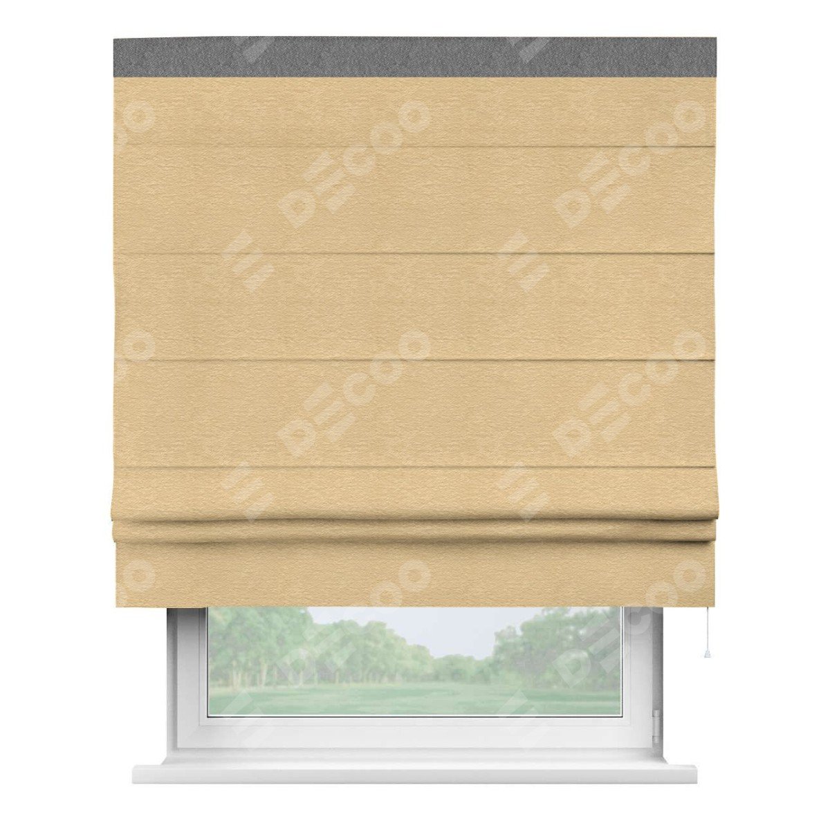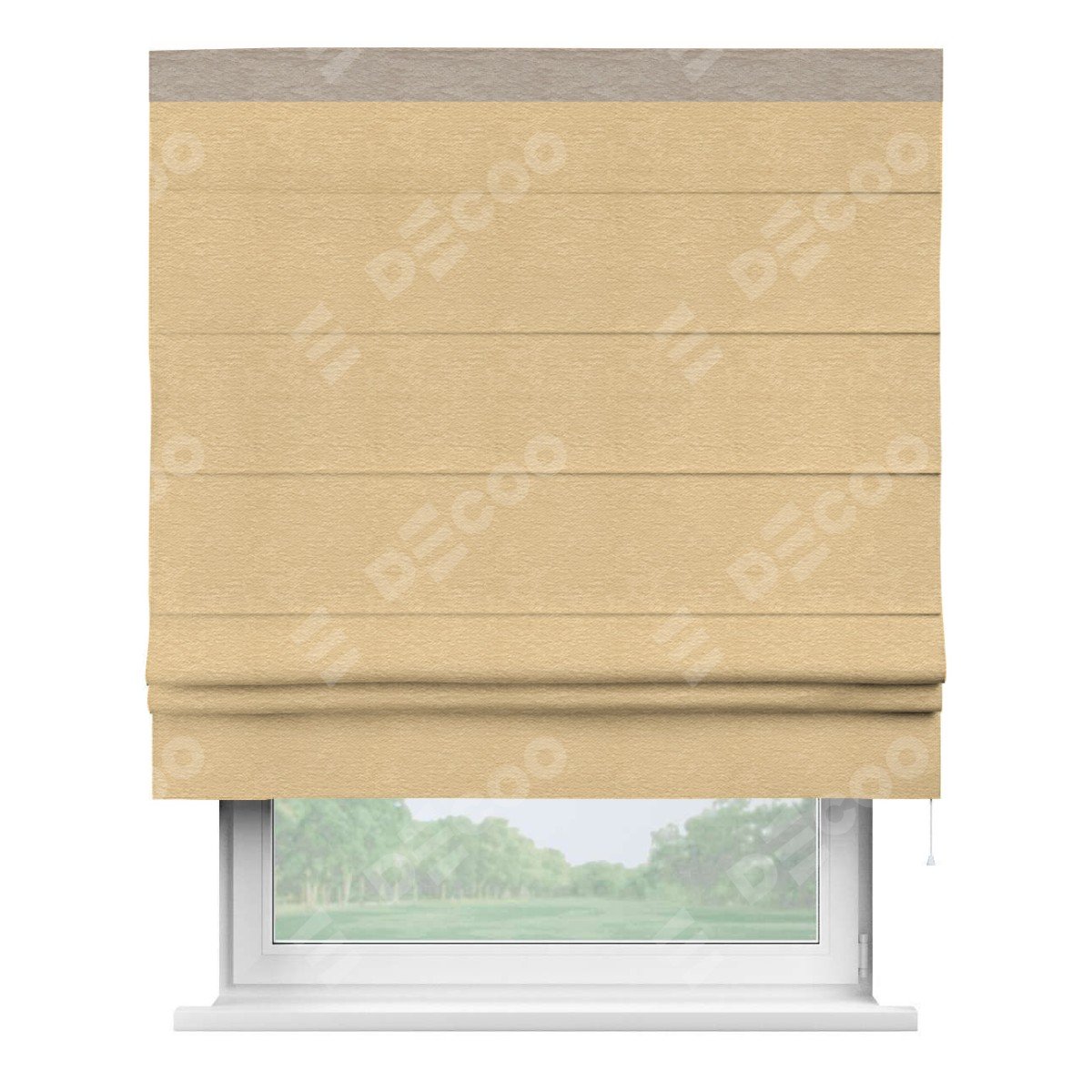 Римская штора производителя «Cortin», используется для проёма, пошита из ткани софт однотонный бежевый, артикул 4202 05. Отделка шторы кантом «Кинг», ткань для канта используется из софта разной расцветки на выбор. Имеет универсальный механизм и подходит для монтажа: на потолок, на стену и в нишу.
