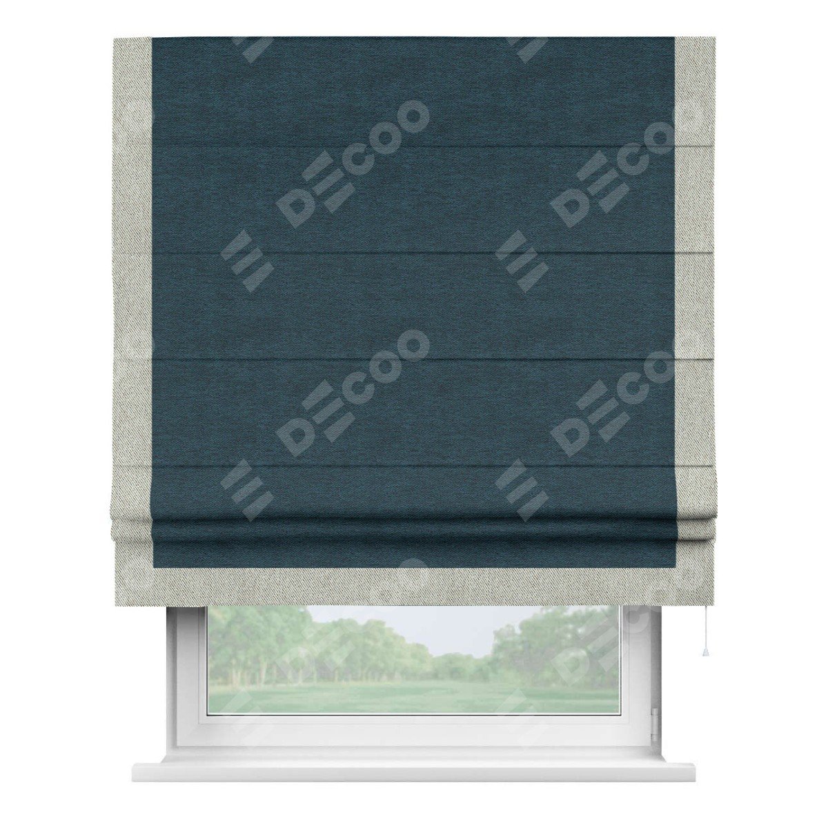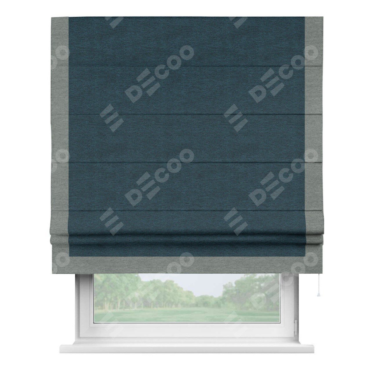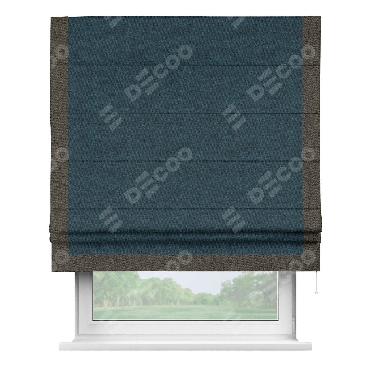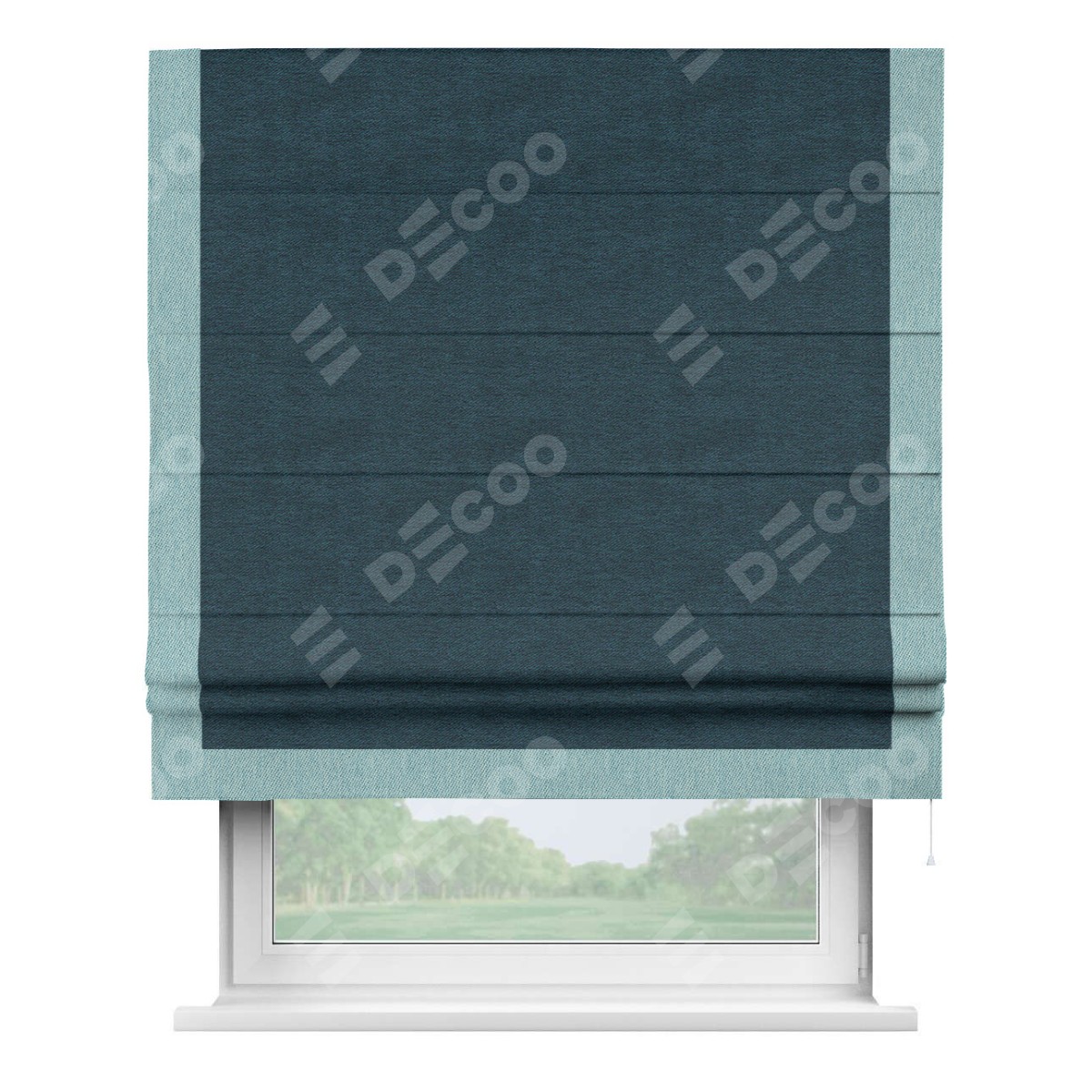Римская штора производителя «Cortin», используется для проёма, пошита из ткани твид блэкаут глубокий синий, артикул 21590. Отделка шторы кантом «Виктория», ткань для канта используется из твида разной расцветки на выбор. Имеет универсальный механизм и подходит для монтажа: на потолок, на стену и в нишу.