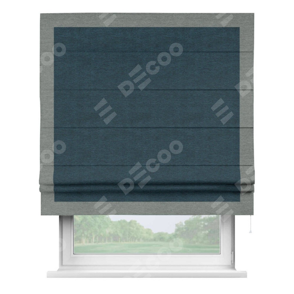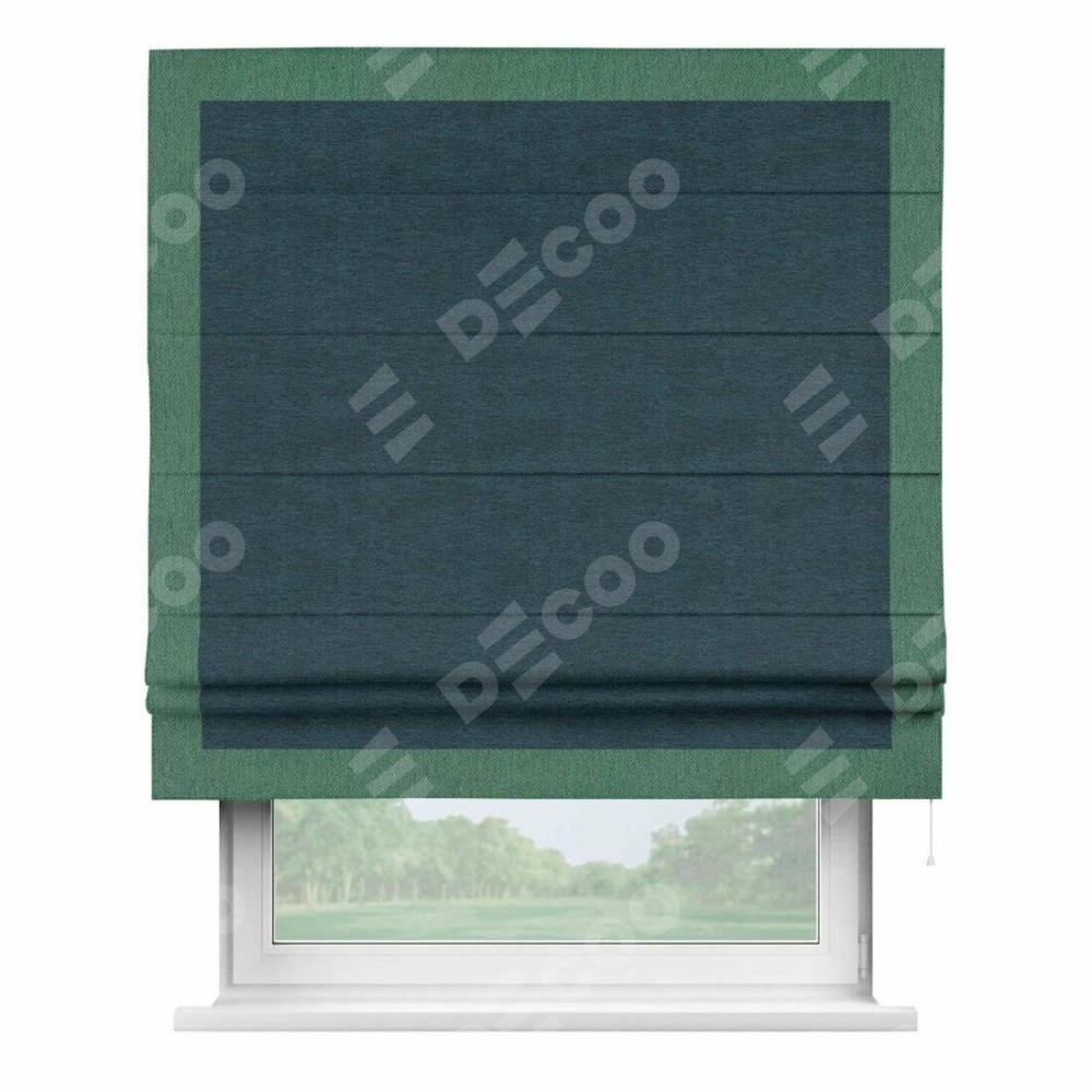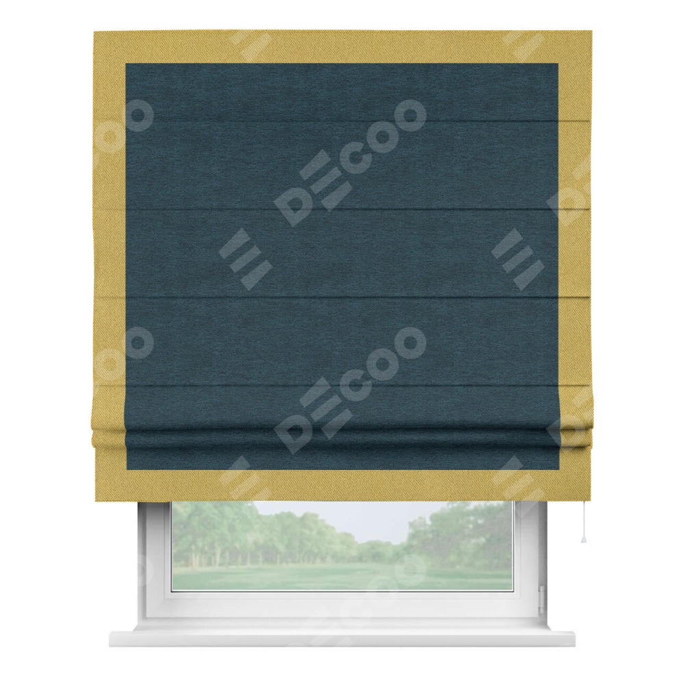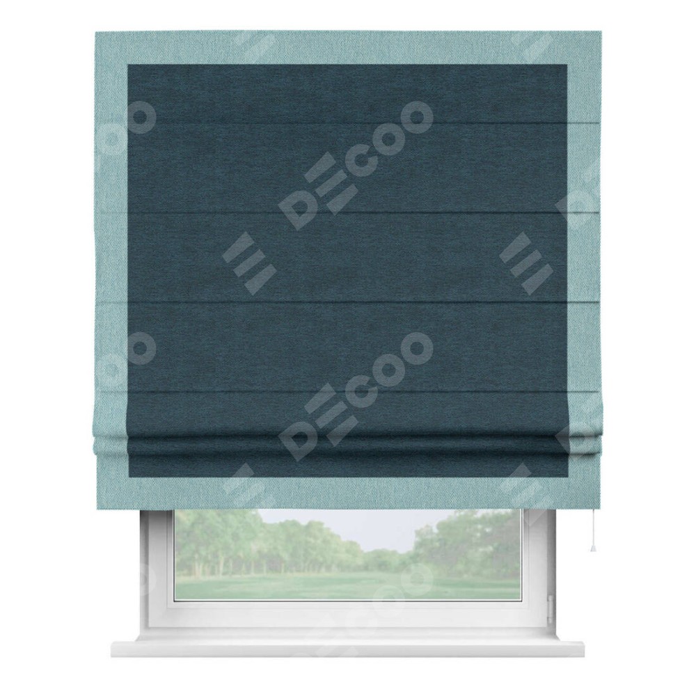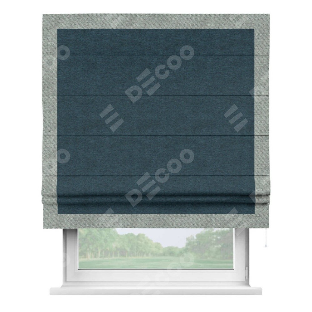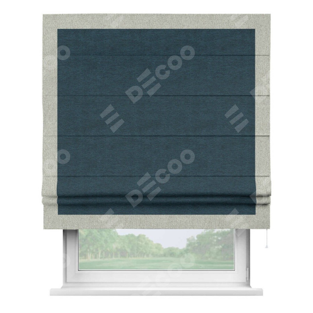 Римская штора производителя «Cortin», используется для проёма, пошита из ткани твид блэкаут глубокий синий, артикул 21590. Отделка шторы кантом «Чесс», ткань для канта используется из твида разной расцветки на выбор. Имеет универсальный механизм и подходит для монтажа: на потолок, на стену и в нишу.