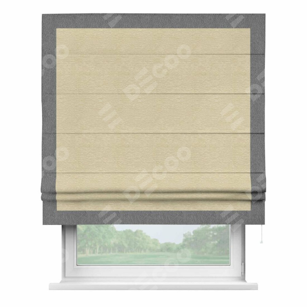 Римская штора производителя «Cortin», используется для проёма, пошита из ткани софт однотонный светло-бежевый, артикул 54426. Отделка шторы кантом «Чесс», ткань для канта используется из софта разной расцветки на выбор. Имеет универсальный механизм и подходит для монтажа: на потолок, на стену и в нишу.