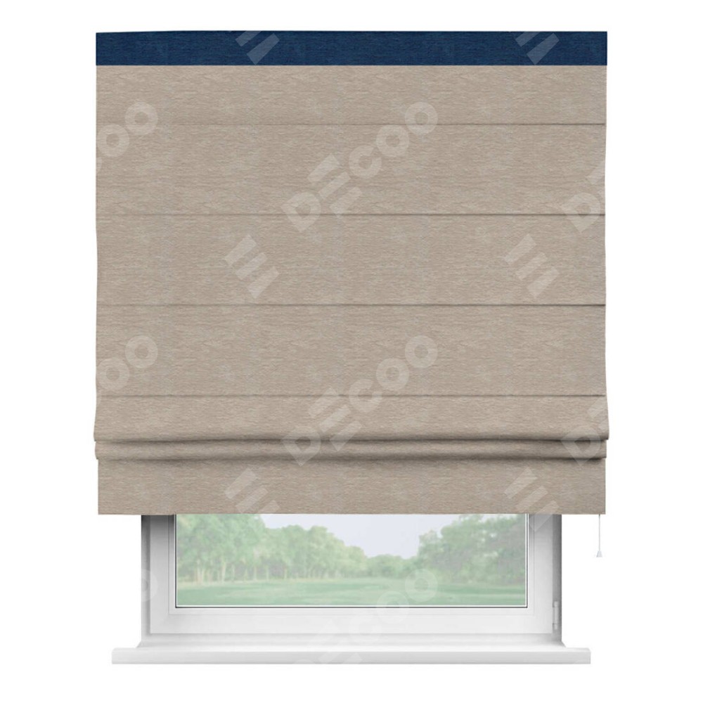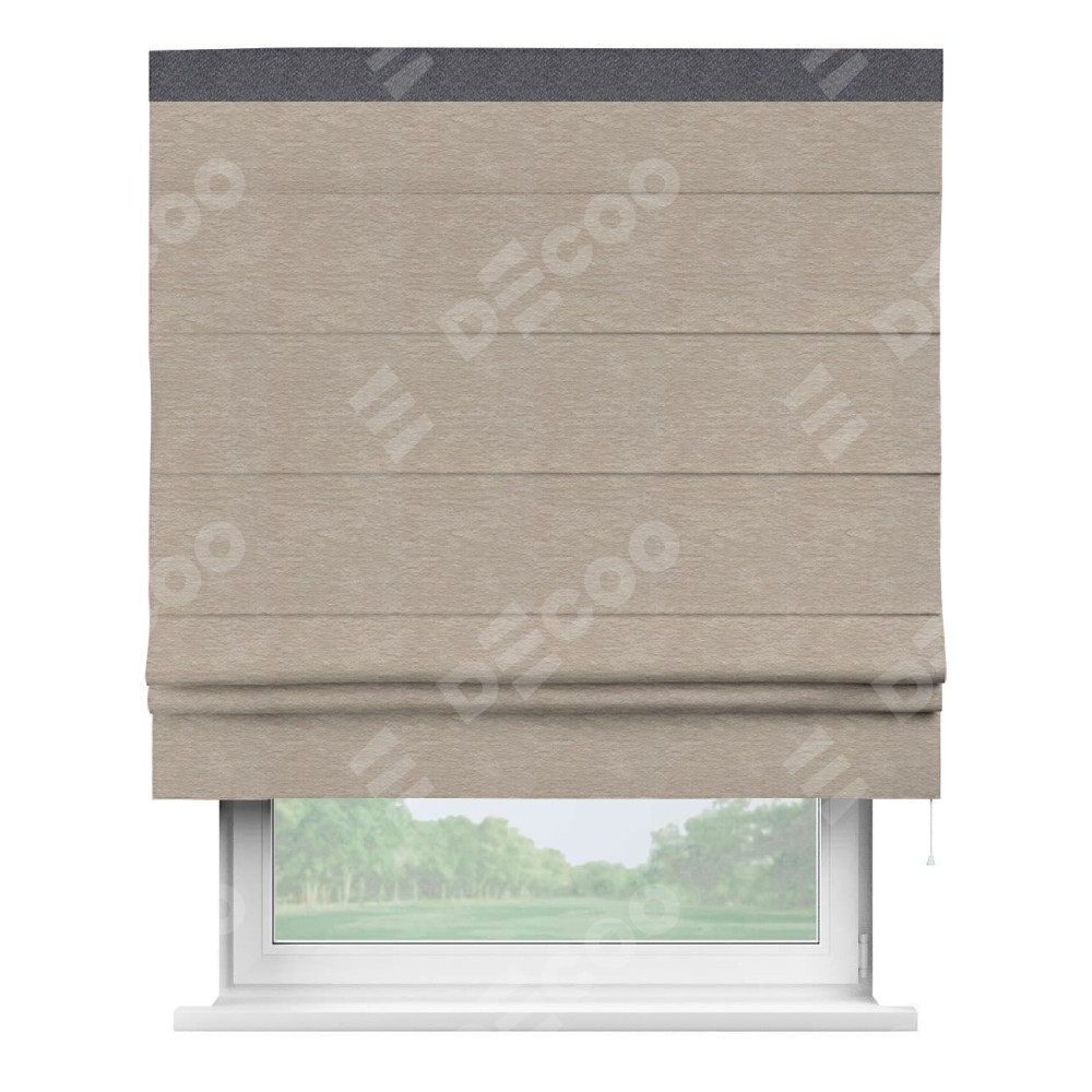 Римская штора производителя «Cortin», используется для проёма, пошита из ткани софт однотонный темно-бежевый, артикул 1640. Отделка шторы кантом «Кинг», ткань для канта используется из софта разной расцветки на выбор. Имеет универсальный механизм и подходит для монтажа: на потолок, на стену и в нишу.