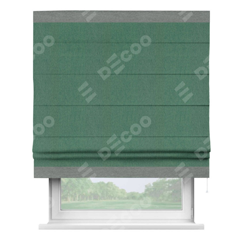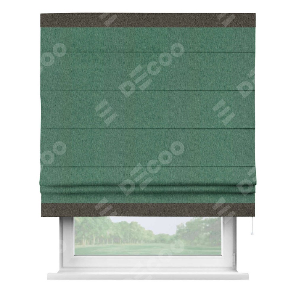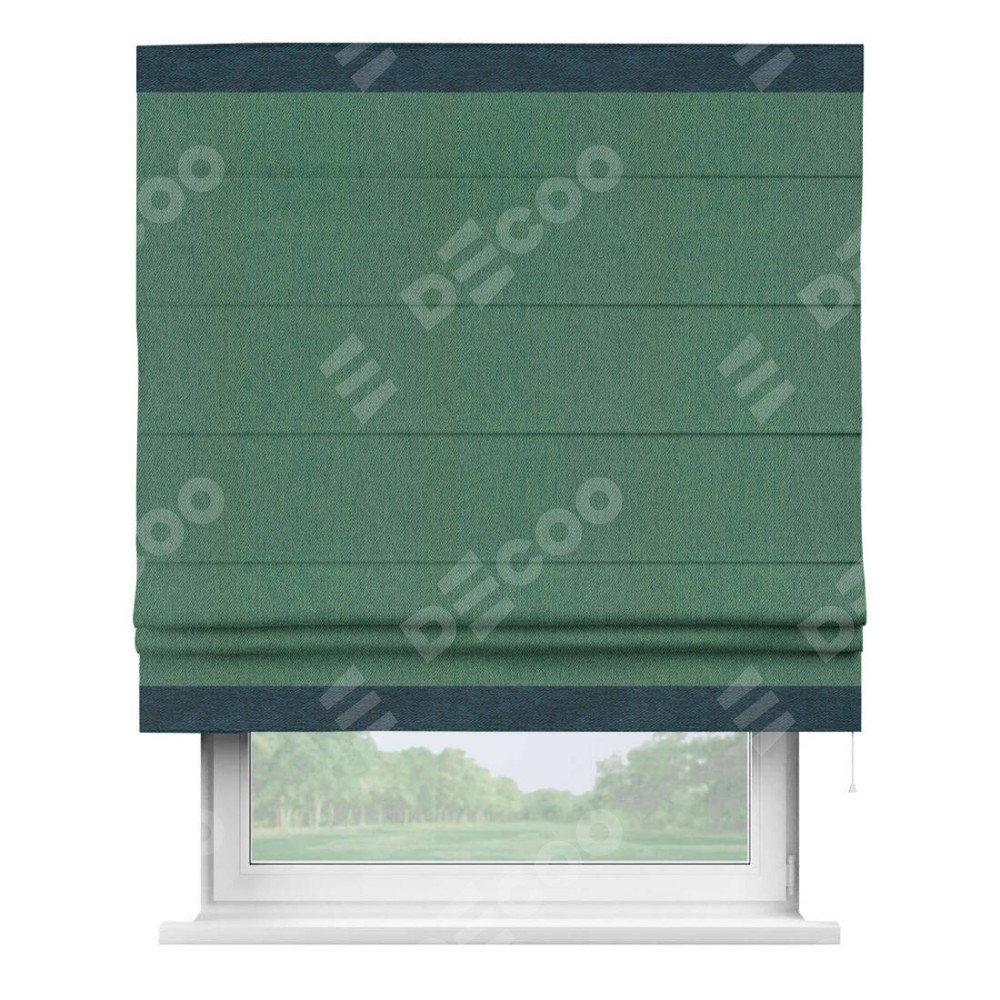 Римская штора производителя «Cortin», используется для проёма, пошита из ткани твид блэкаут зелёный, артикул 21589. Отделка шторы кантом «Горизонт», ткань для канта используется из твида разной расцветки на выбор. Имеет универсальный механизм и подходит для монтажа: на потолок, на стену и в нишу.
