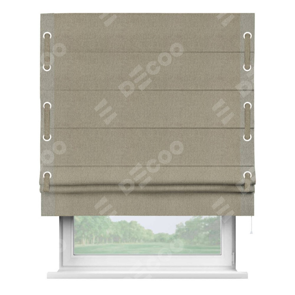 Римская штора производителя «Cortin», используется для проёма, пошита из ткани твид блэкаут кофе, артикул 21575. Отделка шторы кантом «Стрим Дуо» на кантах расположены люверсы с пояском, ткань для канта используется из твида разной расцветки на выбор. Ткань для пояска обычно используется из основной ткани шторы, а так же можно сделать из любой расцветки по желанию. Имеет универсальный механизм и подходит для монтажа: на потолок, на стену и в нишу.