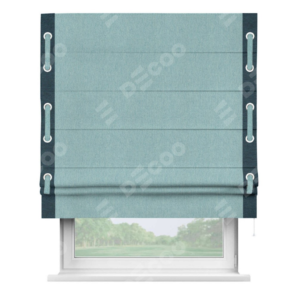 Римская штора производителя «Cortin», используется для проёма, пошита из ткани твид блэкаут небесно-голубой, артикул 21578. Отделка шторы кантом «Кинг», ткань для канта используется из твида разной расцветки на выбор. Имеет универсальный механизм и подходит для монтажа: на потолок, на стену и в нишу.