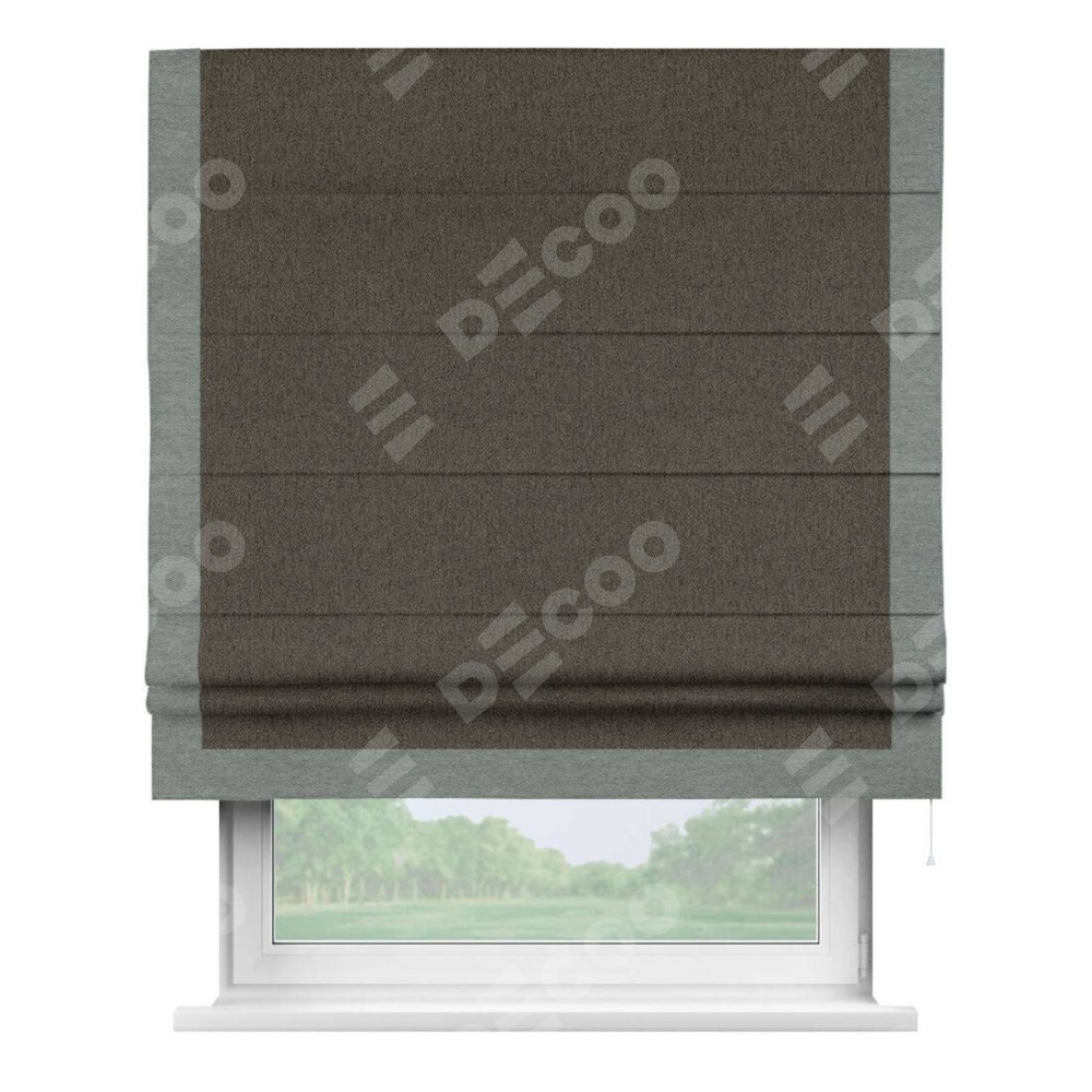 Римская штора производителя «Cortin», используется для проёма, пошита из ткани твид блэкаут тёмно-коричневый, артикул 21584. Отделка шторы кантом «Виктория», ткань для канта используется из твида разной расцветки на выбор. Имеет универсальный механизм и подходит для монтажа: на потолок, на стену и в нишу.