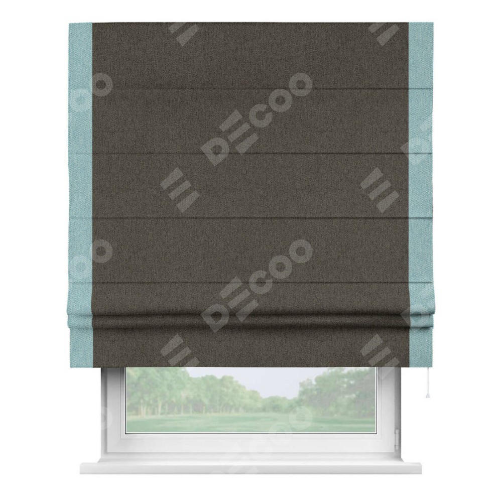 Римская штора производителя «Cortin», используется для проёма, пошита из ткани твид блэкаут тёмно-коричневый, артикул 21584. Отделка шторы кантом «Стрим Дуо», ткань для канта используется из твида разной расцветки на выбор. Имеет универсальный механизм и подходит для монтажа: на потолок, на стену и в нишу.
