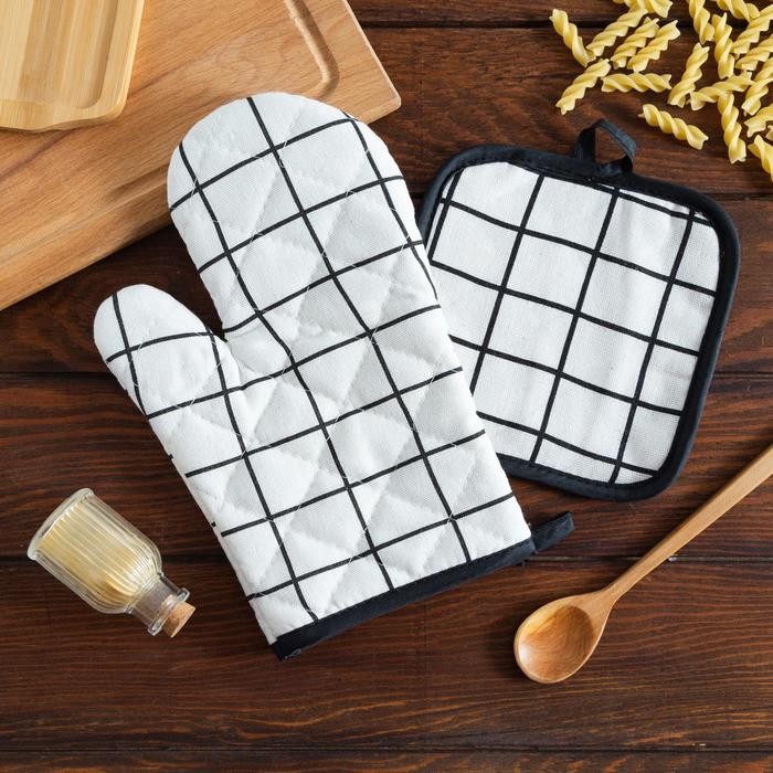 Кухонный набор Доляна «Клетка» цв.белый, прихватка 17*17 см, рукавица 26*16 см,100% п/э